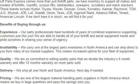 We have fantastic prices on all our lift truck parts. Phone now to get a price quote on one of the attachments or parts we offer. We can be reached at: